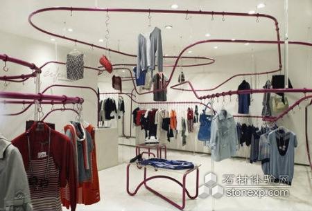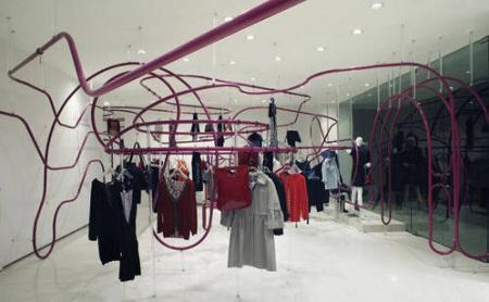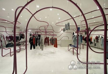 為了突出服裝,設(shè)計(jì)所將整個(gè)地面、墻面和天花板都粉刷成白色,降低其他元素的存在感。店內(nèi)的家具表面,如柜臺(tái),是用與地面相同的瓷磚鑲嵌而成的。它的設(shè)計(jì)非常簡單,就像是從地面中鼓起來的一樣。最后在空間內(nèi)搭起一根全長250米的吊架管。