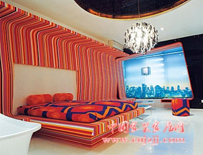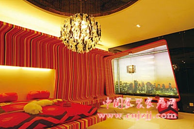 獨特空間形態(tài)專屬于主人生活設(shè)計師在空間布局上做出了全新的嘗試,進(jìn)入房間后是一張大床,會客區(qū)被放到了房間的盡頭,這些獨特的設(shè)計正是設(shè)計師想去表達(dá)的生活理念,也可以躺在浴缸里看電視聽音樂,旁邊放著一杯紅酒一支雪茄,一進(jìn)門就雍懶地躺在一張溫暖舒適的大床上,在窗邊可坐可躺的看看書喝上一杯咖啡,窗外是都市的晚霞……這一幕幕的生活理念也促成了設(shè)計師去創(chuàng)造一個全新的生活空間。浴缸和床上的鏡子、優(yōu)美的曲線都使空間充斥著浪漫的情調(diào)。