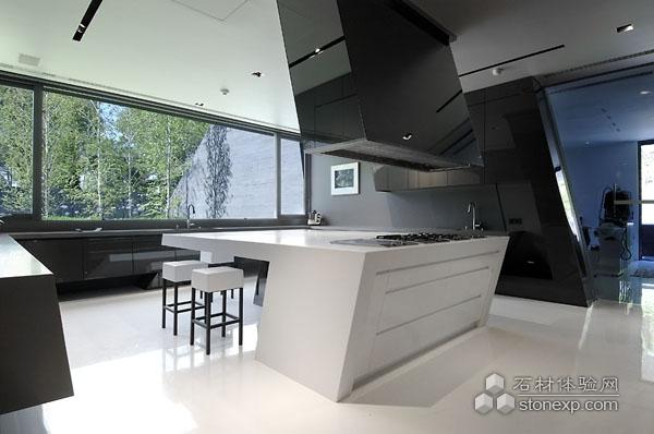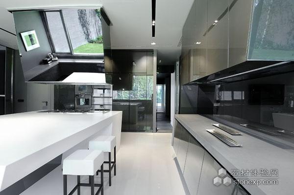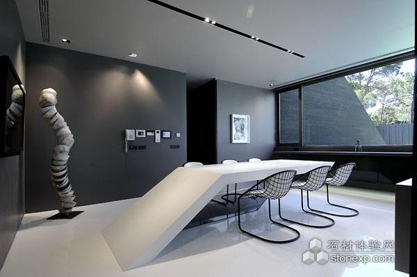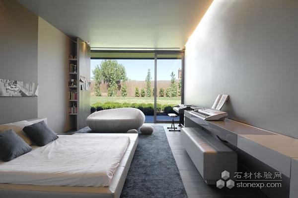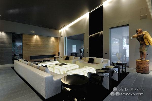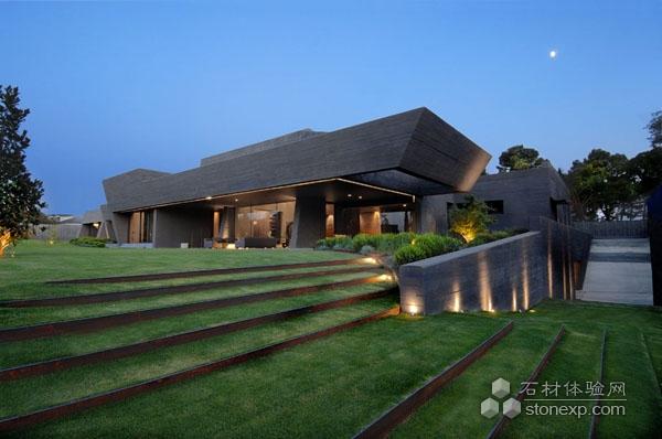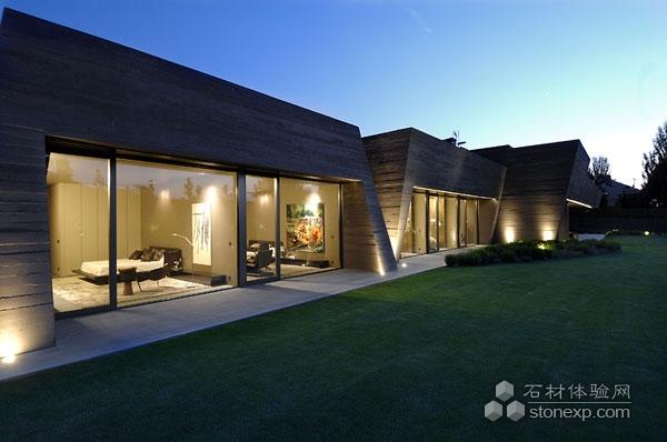 周圍環(huán)境非常優(yōu)美,綠樹、草地、河流、噴泉與整棟別墅融為一體。別墅選用石材作為外墻材料,黑色的顏色給人沉穩(wěn)之感。室內(nèi)設(shè)計(jì)同樣優(yōu)秀,顏色干凈,家具擺放整潔。柔軟的沙發(fā)和地毯,硬朗的浴室臺(tái)面和透光石材效果的茶幾。另外值得一提的是,整個(gè)建筑采用了可再生能源系統(tǒng)與太陽(yáng)能收集系統(tǒng),是一棟完完全全的生態(tài)建筑。
