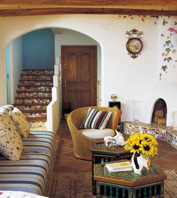 典型的地中海風(fēng)格,多采用白墻、拱門、陶磚、藍(lán)色屋瓦和門窗,飛影家的地中海卻帶有明顯的異域混搭氣息。