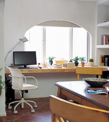 整個(gè)大空間通透開放、自由隨性,書架和書桌也成為空間的一部分。水泥書架、錯(cuò)落有致的凹龕,隨意地?cái)[放著一列列書、一盆盆綠植以及各種帶有海洋氣息的裝飾物。半弧形的窗邊,一塊厚實(shí)的木板隔成的書臺(tái),將書桌與窗融為一個(gè)整體,獨(dú)有一份鬧中取靜的悠然。不必將自己獨(dú)自關(guān)閉在狹小的書房,采用不同時(shí)段空間重組,生活、工作、休閑各不耽誤,以輕松的心情享受每時(shí)每刻的樂趣。