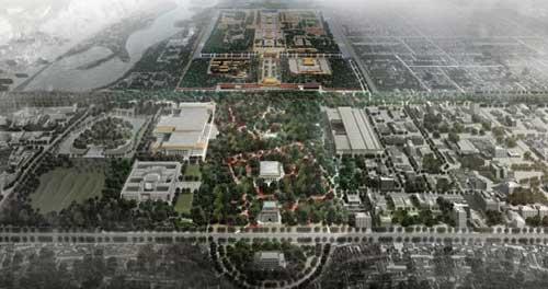 今天的天安門廣場并沒有很悠久的歷史,她幾十年的變遷便是國家意志進程的反映。在成熟和民主的中國屹立起來的2050,類似莫斯科紅場的大型政治性集會和閱兵空間將不再需要,甚至有可能因為交通動力系統(tǒng)的改變,未來的交通都將不再依賴于城市表面的道路,而轉為空中或高速地下交通。那么在結束了其政治和交通兩大功能屬性后,天安門廣場在未來將變成一個什么樣的空間呢?也許地面成為一個森林公園,而將大量的城市文化設施放置在地下與便捷的交通相連,國家大劇院藏在了一個“景山”中,消解了形式并與中南海遙相呼應。2050年的天安門廣場是一個每個人每天都愿意來參與的城市空間,不僅成為真正的人民文化中心,也將成為北京城中心最大的綠肺。[page]