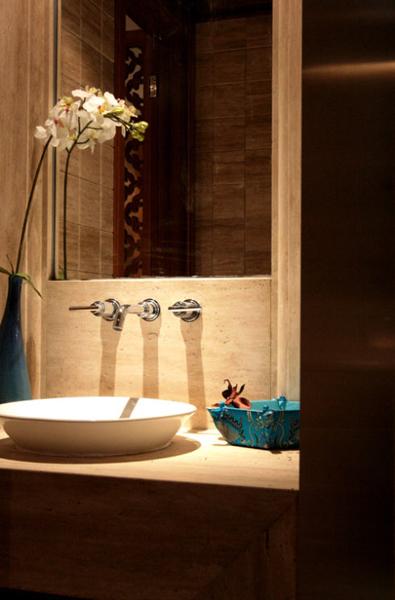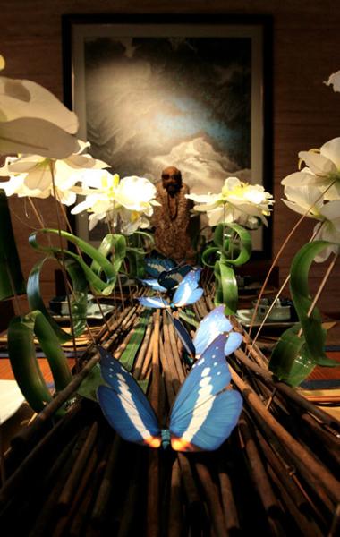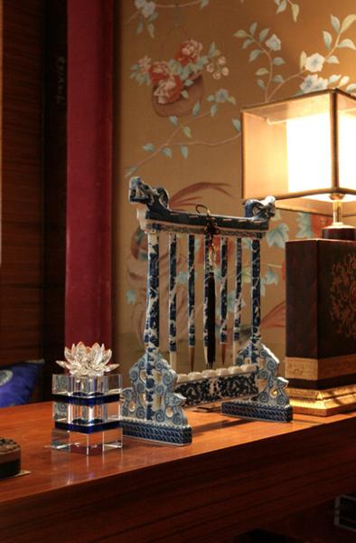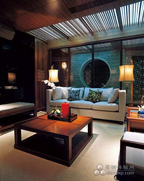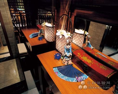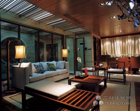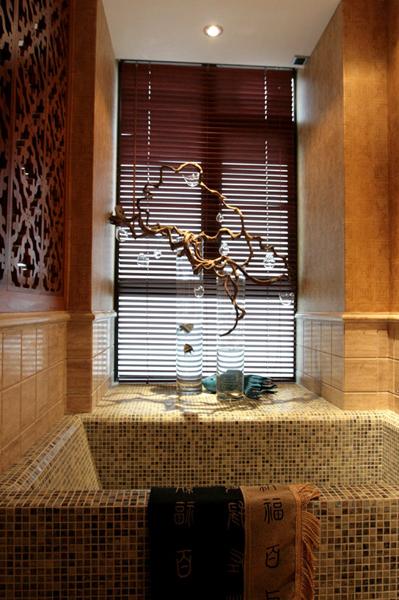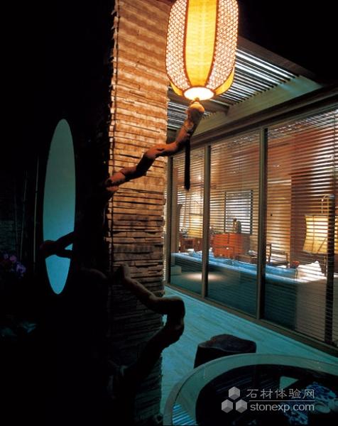 當(dāng)踏入門廳,入戶花園的山、水、竹林、木雕,給人以世外桃源的感受,宮燈、鳥籠、古井、枯枝、茶具、青磚……無(wú)不體現(xiàn)東方的神韻??菥男问讲捎矛F(xiàn)代功能的手法,透過(guò)玻璃制的鏡面看到游水的魚兒。欣賞窗外美景,看魚兒嬉戲,啜一杯清茶,使人仿佛置身于都市的另一領(lǐng)域——休閑、寧?kù)o、平和……