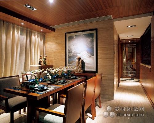 客廳在布局上用現(xiàn)代手法演繹古典韻味,在對(duì)稱均衡中尋求變化,增強(qiáng)空間層次感;在色彩上通過(guò)家私、飾品等的對(duì)比來(lái)表現(xiàn)細(xì)節(jié),使空間不顯沉悶和單調(diào);運(yùn)用現(xiàn)代材質(zhì),如玻璃、羅馬洞石、地毯、實(shí)木等的對(duì)比,既增強(qiáng)現(xiàn)代感又不失整體中式感,使整體景象的創(chuàng)造力求作到:“熟悉中有新意,協(xié)調(diào)中有變化,平淡中有味道,古典中有現(xiàn)代時(shí)尚的元素。”