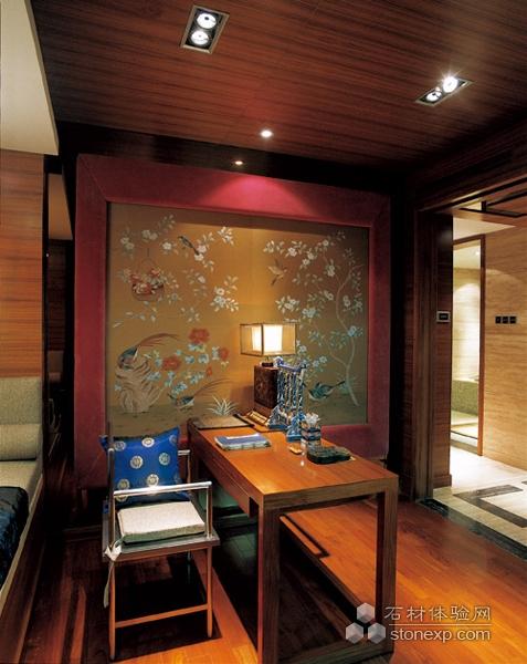 由于時(shí)間關(guān)系,綠竹還沒(méi)有種上,但隨意的畫卷、陳竹、卵石已有了庭院竹林的意境,作為劃分空間區(qū)域之用的推拉門,也別有一番韻味,同時(shí)對(duì)小空間采光達(dá)到了很好的輔助作用,甚至可以引進(jìn)陽(yáng)光。書房在竹子的映襯下,頓悟了蘇東坡先生:“可使食無(wú)肉,不可居無(wú)竹……”。書房的陳設(shè)中挑選了江南少女的雕像在木質(zhì)雕花的映襯下展現(xiàn)其婀娜多姿,來(lái)改善中規(guī)中矩的書架的呆板。