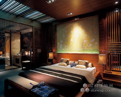 一幅柔和的絹絲畫、珠簾在風(fēng)中搖擺,泛灰色的布幔讓整個(gè)空間彌散著浪漫、柔和的氣息,通過(guò)珠簾幕讓主臥與化妝間既有聯(lián)系又有分割,而且給主臥添增了一道風(fēng)景,意在營(yíng)造舒適、寧?kù)o的休息空間。次臥借用古代臥室的做法,采用睡榻形式讓主人“養(yǎng)精蓄銳”之時(shí)也頗有幽古之思,也是主人休憩、品茗的另一空間。