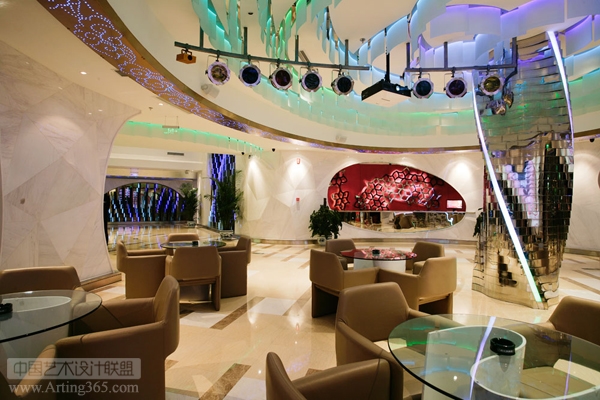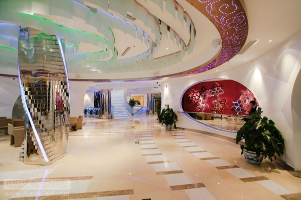 首先是構(gòu)圖。以平視為主,景深較大,多取橫向的全景式布局。同時(shí)由于北方氣候干燥,更多加入了水的元素,這樣與兩側(cè)墻壁裸露的白色巖石形成鮮明的對(duì)比群山之意。 一進(jìn),在圓型律動(dòng)的接待大廳,園廳主軸為螺旋柱體,借燈光的旋律盤(pán)旋而上,引發(fā)萬(wàn)花筒原理的吊燈,由內(nèi)而外散發(fā)氣氛,同時(shí)又像水波紋一樣,碧波蕩漾,當(dāng)你坐在大廳的休息區(qū)椅上時(shí),不自覺(jué)的產(chǎn)生一種無(wú)限歡快的遐想。在大廳兩側(cè)白色墻面,有一種自然山水之意,用中國(guó)山水畫(huà)中的山——棱角分明,追求一種“妙在似與不似之間”的感覺(jué),其次用到了皴法。在山水畫(huà)史上,凡有巨變,多由皴法所致。用此種技法來(lái)描繪山、石的脈絡(luò)和質(zhì)感,所以周?chē)曈X(jué)面設(shè)計(jì)出棱角分明的弧墻,以燈光加深其眾多的凸起于凹陷,營(yíng)造出一種獨(dú)特而時(shí)尚的光影效果。
