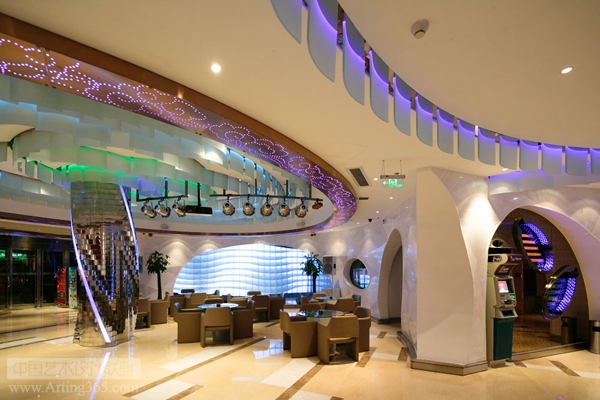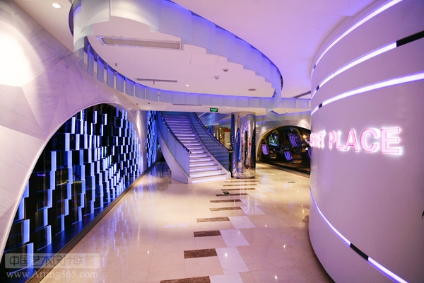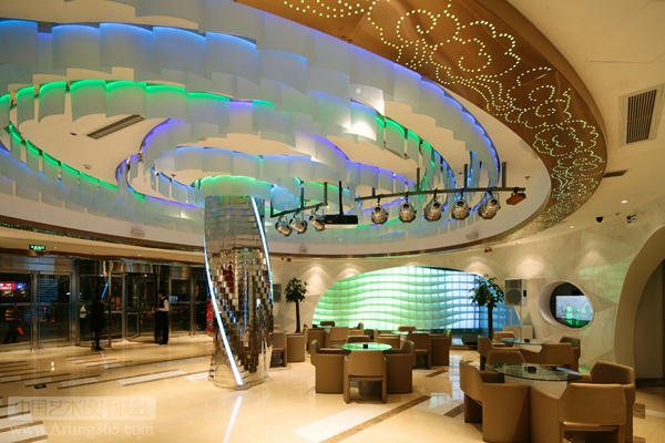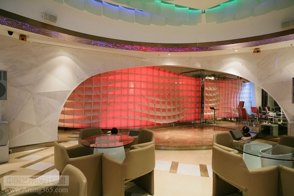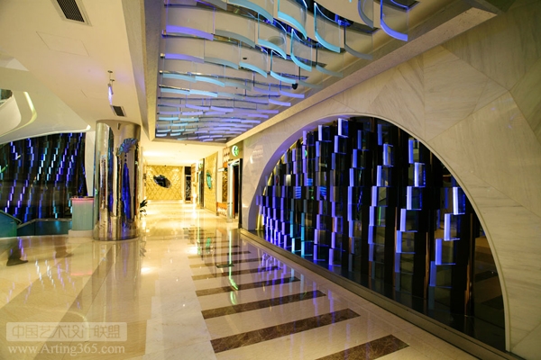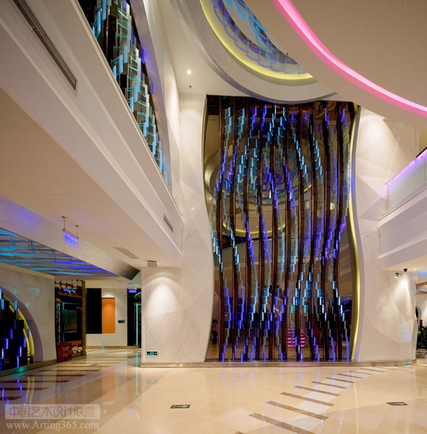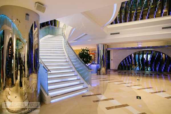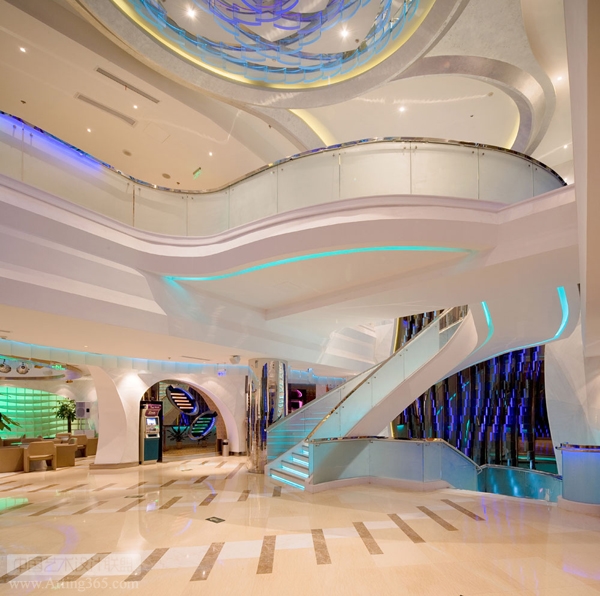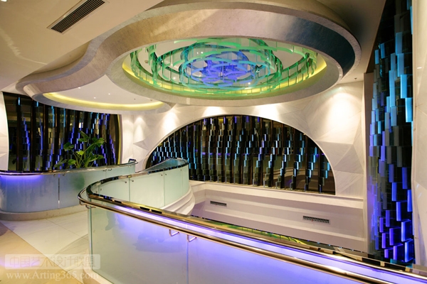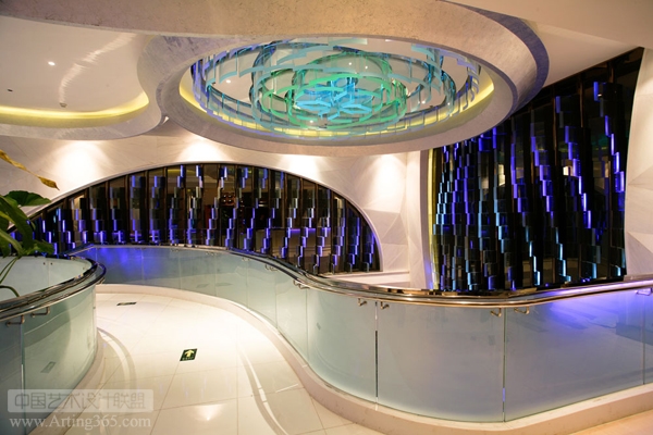 二進(jìn),這里用到了意境,講究墻面留白的布置和瀑布的“氣勢(shì)”。更多的用透明材質(zhì)和不斷變幻的LED燈光來(lái)“表現(xiàn)”藝術(shù),表現(xiàn)“氣韻”、“境界”,這也是國(guó)畫(huà)的精髓所在。貫穿三個(gè)樓層的挑高梯廳,吊燈依然延續(xù)萬(wàn)花筒的設(shè)計(jì),隱喻水浪的藍(lán)白光影交錯(cuò),從里向外漫開(kāi)。我們看到中間墻面是借由立體而動(dòng)態(tài)的多層次玻璃瀑布,玻璃及LED燈以似緞帶亦似流水流動(dòng)般將空間完整的結(jié)合,將高挑的空間無(wú)時(shí)無(wú)刻的呈現(xiàn)如瀑布般的水流宣泄而下,同時(shí)用LED多彩燈效來(lái)演繹瀑布流動(dòng)之景。