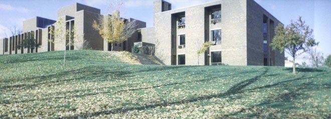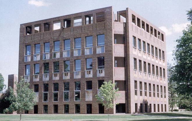 1957年,康成為賓夕法尼亞大學建筑學的知名教授。他所設計的賓州大學理查茲醫(yī)學研究大樓( Richards Medical)(1960-1965)突出展示了“醫(yī)生區(qū)”與“病人區(qū)”的空間區(qū)別。病人區(qū)通常包括樓梯間、電梯、排氣口以及進氣口、管道等都分別在四個單獨的塔里;而醫(yī)生區(qū)就不同,主要包括實驗室和辦公室,實驗室的建筑幾十年來一直都是照此設計??祵嶋H的特征運用于建筑原則之中,加利福尼亞拉霍亞索克研究中心(Salk Institute La Jolla CA)(1959-1965)正體現(xiàn)了他這一成熟的風格,也是其最好的例證。康從古典建筑和中世紀建筑風格中得出的靈感,并運用基本的幾何圖形以及混凝土和磚瓦之類的原材料成功地建成了耶魯大學藝術(shù)中心(Yale Center for British Arts)(1977)。