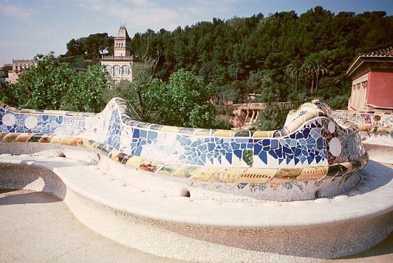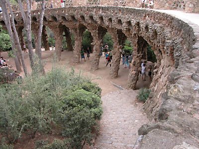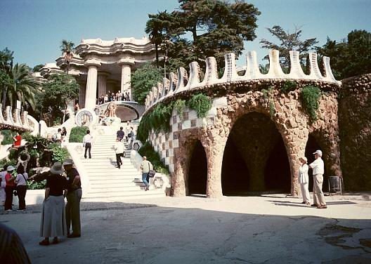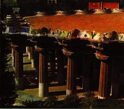 高迪把這一大片山地劃分成十幾塊單獨的地塊并用大圓石作了標記,接著浩大的建筑工程就開工了。正是在古埃爾公園這里,高迪成功地將大自然與建筑有機地結(jié)合成一個完美的整體。這里的一切——小橋、道路和鑲嵌著彩色瓷片的長椅,都蜿蜒曲折,好像漂蕩流動著似的,構(gòu)成詩一般的意境。按建筑師的意圖將成為未來居民休憩場所的中央廣場,建有柱廊,但其中的柱子沒有一根是筆直的,全像天然森林中的樹干。