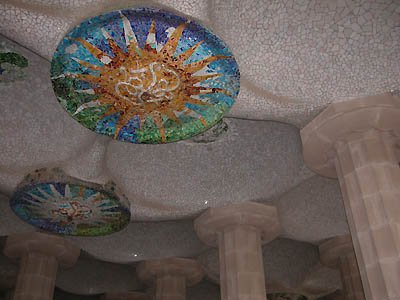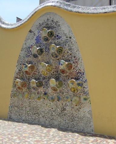 公園圍墻也很有特色,圍墻下部以普通碎石砌筑,上部向外出挑,以光滑的馬賽克飾面,這樣就可以阻止外人進入,使藝術(shù)與功能巧妙結(jié)合,圍墻頂上每隔8m設(shè)一圓形裝飾,彩色馬賽克拼成西班牙文的“古埃爾公園”。由于公園的建筑材料幾乎全部選用了廉價的地方材料,不僅經(jīng)濟合理而且充滿了濃郁的鄉(xiāng)土氣息。
