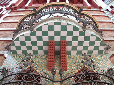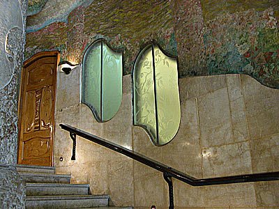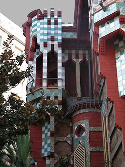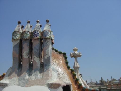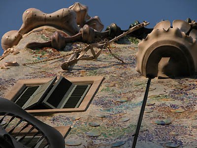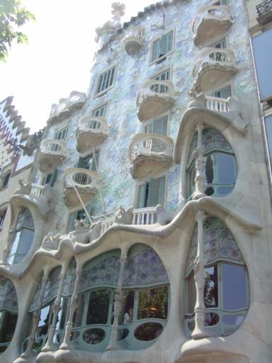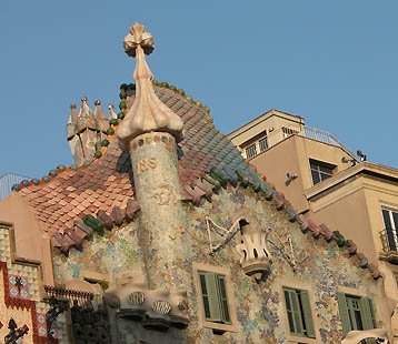 這是對一個舊建筑的"高迪化". 高迪在這里表現(xiàn)了他對于色彩和外墻裝飾的理解, 也表現(xiàn)了他豐富的想象力和對于不同材料和顏色的駕馭. 龍形的屋頂下是骨骼狀的陽臺.飾件都有圓弧, 都是流動的.