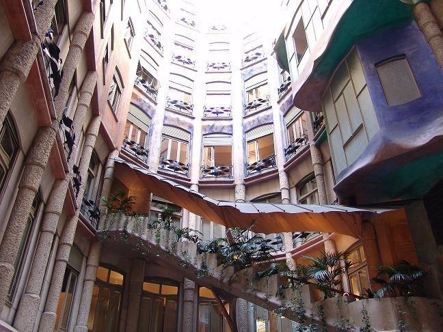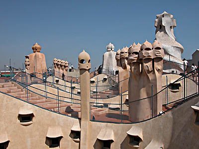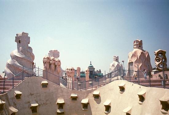 全巴塞羅那最有名的建筑:Casa Mila(米拉之家)原是公寓樓. 在當(dāng)?shù)貏t以「La Pedrera(采石場)」聞名(1906---1910). 米拉之家是用一組組石質(zhì)隔墻和柱子為結(jié)構(gòu), .大的陽臺和窗戶. 中間有兩個天井. 不同高度的頂樓形成.有波狀的樓頂. 獨特的陽臺和窗戶設(shè)計, 再加上巨大神秘造型的通風(fēng)口, 在當(dāng)時引起相當(dāng)大的騷動,人們認為此建筑若非出自惡魔之手就是瘋子所為。