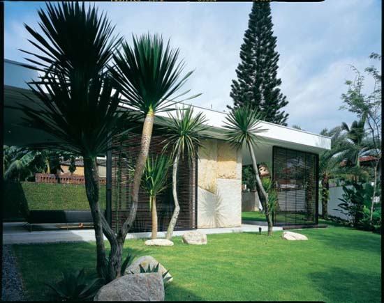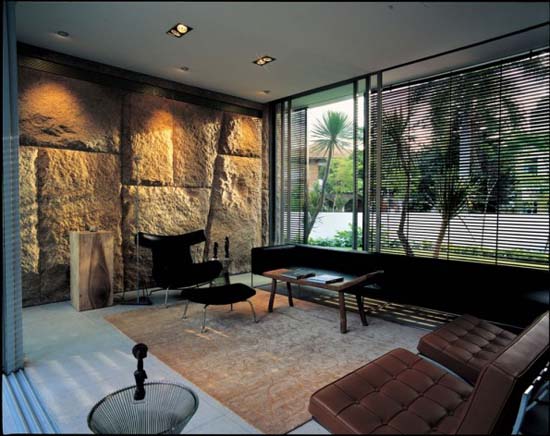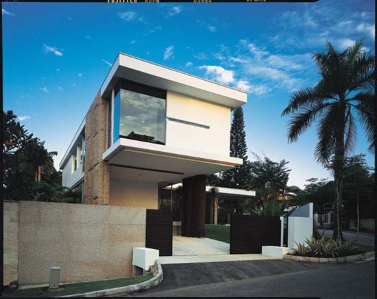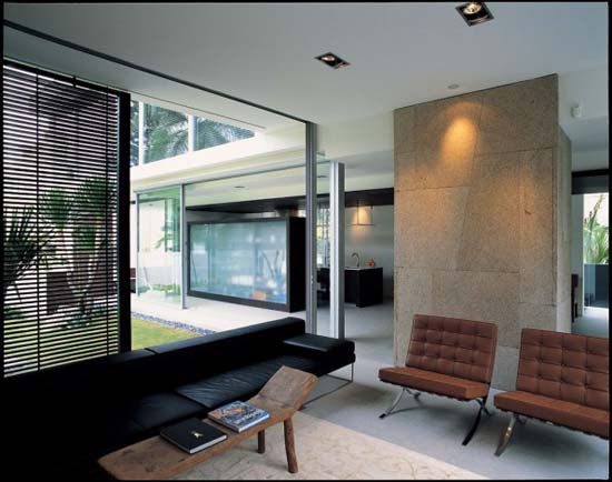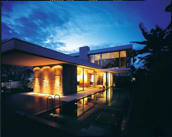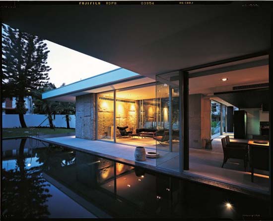 Khai House是位于新家坡的一棟私人住宅。良好的透光性與視覺的無窮感是房子最主要的特點(diǎn)。追求空間的最大化,但卻讓人感覺不到傳統(tǒng)的墻體的存在。外形上,房子成兩個(gè)互相垂直的直角。上面一層是臥室,地面一層是活動(dòng)區(qū),而地下室則是傭人的宿舍。