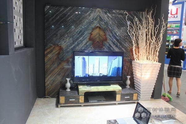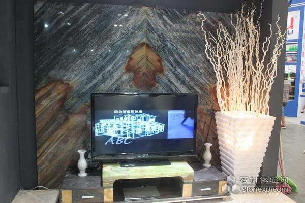 此款特色石材藍貝電視背景墻是來自第十二屆上海別墅配套設(shè)施展中環(huán)球石材展出的展品,兩塊藍貝對拼成背景墻,線條流暢,紋路獨特。