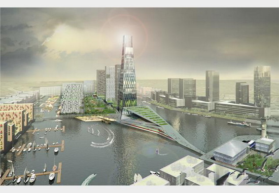 這個建筑面積為170萬平方米的規(guī)劃申請,是由開發(fā)商皮爾控股公司(Peel Holdings)在2009年12月份提出的。該項目包括由一些大的建筑事務所——SOM、“格倫-豪厄爾斯建筑事務所”(Glenn Howells Architects)、阿爾福德-霍爾-莫納漢-莫里斯建筑事務所(Allford Hall Monaghan Morris)和HKR建筑事務所設計的項目。