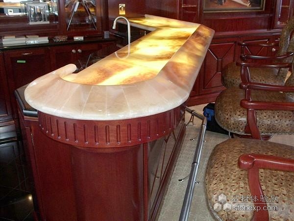 簡單描述:具有玉石特質(zhì)的天然石材具有良好的透光效果,多運用于吧臺臺面,在各色燈光的照射下,光彩奪目。