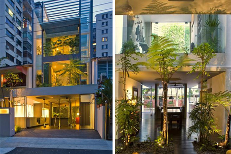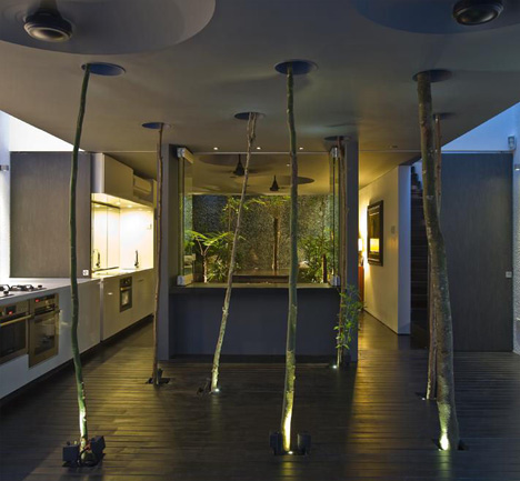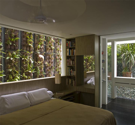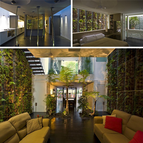 此房子的室內(nèi)設計以黑白為主色調(diào),及其簡潔。然而室內(nèi)隨處可見的綠綠的樹木以及爬滿墻上的苔蘚,卻讓人仿佛置身叢林。各種綠色的大小樹木、苔蘚穿梭在鋼筋、水泥、玻璃之間,與室外的綠化相呼應,甚至弱化了室內(nèi)室外的概念,堪稱真正的生態(tài)之家!