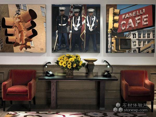 Firmdale酒店能橫掃倫敦高級酒店業(yè),主要靠的是姬特·坎普(Kit Kemp)的古怪、非主流的室內(nèi)設(shè)計??财掌珢塾蛺蹱柼m藝術(shù)家,在公司開辦的第一家美國酒店——擁有86間客房的克羅斯比街酒店,她又加入了一些觸目驚心的藝術(shù)品:其中包括賈斯汀·史密斯(Justine Smith)、杰克·米爾洛依(Jack Milroy)、安塞姆·基弗(Anselm Kiefer)和卡勒姆·英尼斯(Callum Innes),在大堂接待處還放著豪梅·普朗薩(Jaume Plensa)的一件10英尺高的不銹鋼人頭像。地下放映廳是許多電影的首映地,其中包括詹姆斯·弗蘭科主演的《嚎叫》,去年秋天舉行的開業(yè)慶典上,他們委托雕塑家、攝影家簡·羅曼·西耶弗里德(Jean Roman Seyfried)為制作了一部縮時(time-lapse)電影,描繪了克羅斯比從一個停車場走到今天的變遷史。