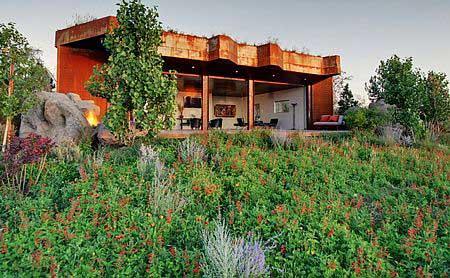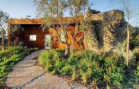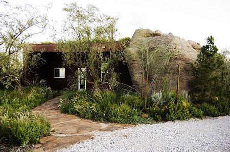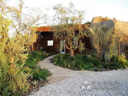 按照這種理念設(shè)計(jì),美國(guó)約書亞樹村石頭屋住宅前面有一個(gè)巨大的卵石,用來(lái)遮掩住整個(gè)住宅,讓周邊的所有建成環(huán)境完完全全的消失掉。房屋前的人造卵石能在下午的時(shí)候吸收很多很多熱量,然后慢慢傳到住宅的金屬、木材、混凝土和玻璃結(jié)構(gòu)上去。