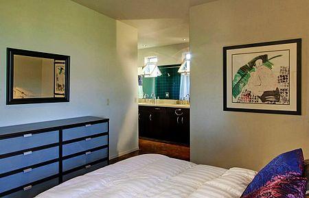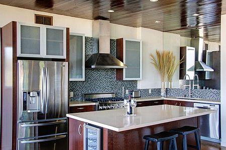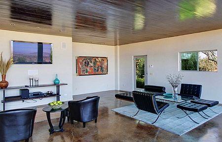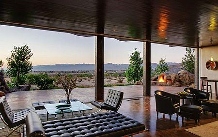 美國(guó)約書亞樹村石頭屋住宅內(nèi), 10英尺高定做的樓層高小型玻璃門把生活區(qū)和景觀連接在一起,打造了通透感和光感。景觀屋頂和觀景平臺(tái)也為這個(gè)石頭屋子住宅創(chuàng)造出了一個(gè)非常迷人的環(huán)境,巨型卵石中徐徐燃燒的火爐和怡人水景也進(jìn)一步加強(qiáng)烘托了這種氛圍。