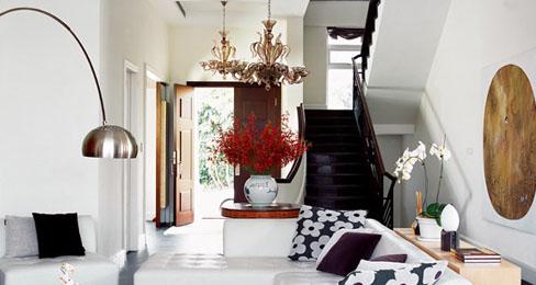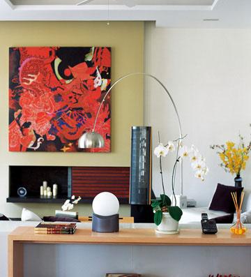 色彩上,每個空間都有一個主色調(diào)被大面積使用,再加上對比色的點綴,像客廳純白的沙發(fā),白色的地毯和白色的墻,連成一片,讓人心情豁然開朗,加上黑色的地磚和紅色的鮮花,優(yōu)雅而大氣。而一盞弧形落地?zé)?,長長的燈桿以完美的弧度劃破規(guī)則的空間,如同神來之筆讓客廳頓時充滿生氣。