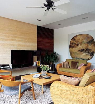 在家居飾品上,環(huán)保的家具成為一個特色。楊實在每個樓層都設(shè)一個古色古香的小吊扇。在周邊環(huán)境充滿自然氣息的小別墅里,風(fēng)扇的使用顯然比空調(diào)更合適而且節(jié)能。同時藤、木、竹類天然材質(zhì)家具被大量運(yùn)用,從泳池旁的帶頂篷藤編椅,到二樓休息室的一套藤質(zhì)家具、木椅,半遮半卷的竹窗簾,這些設(shè)計簡約的東南亞家品,帶出特有的原始而古樸的風(fēng)情。