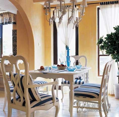 所以他親手設(shè)計的家整個空間都少有浮華的裝飾,力求體現(xiàn)地中海家居清爽、純美的自然氣息。運用象征沙灘的白色和代表大海的藍色形成色彩對比,米黃色的墻面予以太陽的光輝,連續(xù)的回廊和拱門,造型古樸圓潤的壁爐,陶磚藝術(shù)裝飾和馬賽克拼飾,這些都是地中海家居的靈魂密碼。純白的餐桌映襯清澈、靈動的燭臺,藍色條紋圖案的窗簾迎送徐徐海風。角落里,手工鐵藝飾品細膩精巧,淘來的海星帶著自然的脈動,形成一種別有情調(diào)的組合,模擬出地中海原地自然的美感,令人心動。
