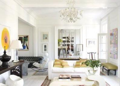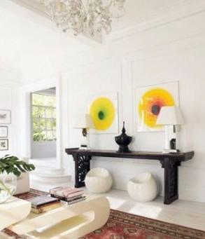 對稱的家具格局,中西結合的混搭風格。墻上兩幅明亮鮮艷的裝飾品,提亮了空間中較內斂的色彩。