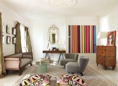 設計師繪制的條紋藝術品被掛在主臥休息區(qū)內的墻面上。大膽的用色,打破傳統(tǒng)的裝飾慣例。