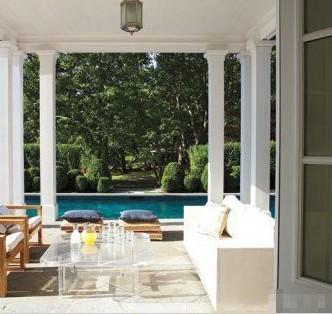 門廊的整體構架設計保留了別墅的原貌,在家具上稍做了突破。透明材質的茶幾,讓休閑區(qū)看起來更加清爽宜人。
