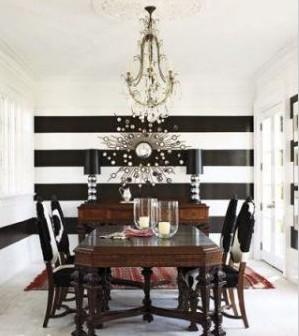 餐廳里,黑色被加以利用,黑白粗條紋墻面,帶來視覺上強大的沖擊力。放射狀的鏡子讓墻面的裝飾效果更加顯著。