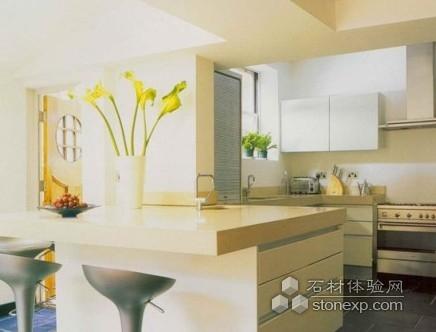 廚房,淺黃色的主打色調,簡約的整體櫥柜,旁邊的這個小吧臺非常溫馨,深夜不想睡的時候可以來這里喝一杯。