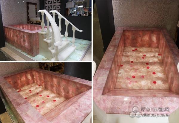 隨著越來越多的人開始追求個性化的需求,環(huán)球石材創(chuàng)意產業(yè)部本著以如何解決客戶和設計師的個性化需求為其創(chuàng)造價值作為行業(yè)理念,研發(fā)出了石材與眾多其它材料結合起來的新產品。如利用非常稀有、名貴的粉紅色天然水晶切片拼接的浴缸, 水晶晶瑩剔透,配合高端的裁切拼合技術,使得整個浴缸渾然一體,宛如一件稀世的工藝品。在水晶浴缸周圍所鋪設的石材地磚是利用綠玉石加工而成的透光地板,背面為鋼化玻璃,下設燈管,優(yōu)質的天然石材在光源的照射下顯得更加光華奪目。在其旁邊的洗手臺為全瑪瑙質地,周圍是貝殼拼板墻面,這樣的搭配完美的展示出了石材最為華麗的一面。