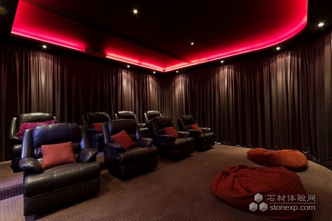 這棟住宅設(shè)有壁球場、小酒吧、酒窖、洗衣房和一條13英尺左右(約4米)高的室內(nèi)瀑布。還配有玻璃電梯和一個10個車位的停車場。上圖是家庭影院。[page]
