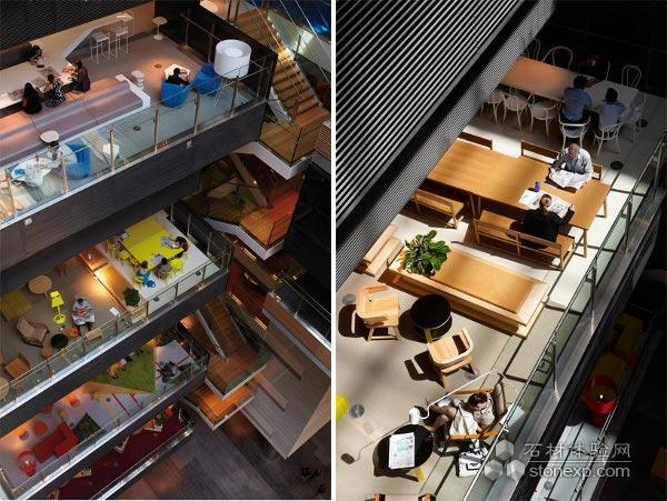 為了彌補(bǔ)大尺度所帶來的弊端,這個(gè)項(xiàng)目通過對(duì)布局的分解為小環(huán)境的活躍提供機(jī)會(huì)。其中包括了許多為特定工作設(shè)置的“節(jié)點(diǎn)”,這些節(jié)點(diǎn)漸漸從“娛樂”發(fā)展成“創(chuàng)造”,中心天井從底層到頂層將不同樓層隱約的暴露在外。每一層都設(shè)計(jì)成了不同的風(fēng)格,當(dāng)人們從公共空間觀察這些樓層時(shí)就會(huì)產(chǎn)生動(dòng)感的效果。