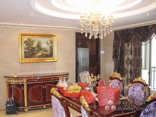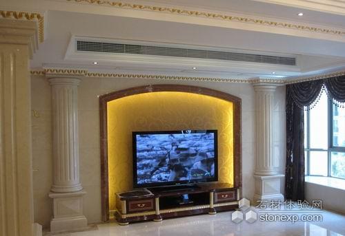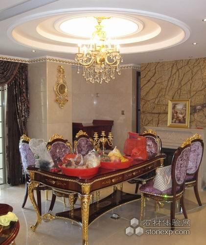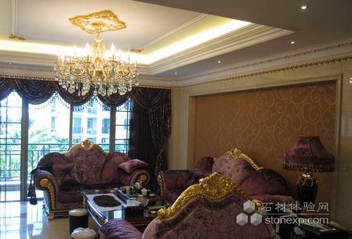 采用沙安娜米黃大理石以淡雅墻紙先結(jié)合。軟硬材質(zhì)的對(duì)比使整體空間更加和諧。一對(duì)玉立的米黃大理石柱,配上意大利倫勃朗鍍金歐式沙發(fā)使整體更加高貴大氣、溫馨舒適。