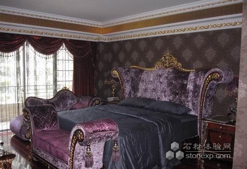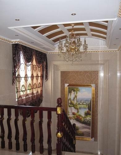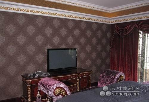 深色的歐式墻紙。頂上的PU線條描金給人營(yíng)造出雍容華貴的感覺。