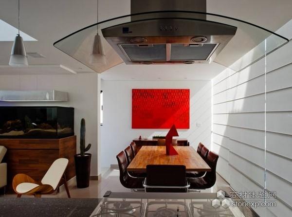 這所房子最引人注目的地方莫過于它的外形仿若三個(gè)臺(tái)起來的盒子。實(shí)際上,它的內(nèi)部空間是被這三個(gè)所謂的“盒子”分割成了三個(gè)主要的區(qū)域,并且的確也成為了室內(nèi)空間的界線。而根據(jù)設(shè)計(jì)師的理念,這也為家庭影院、廚房、樓梯這三個(gè)區(qū)域創(chuàng)造了一種“相互依存”的辯證關(guān)系。
