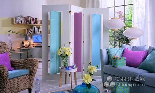 打造手段:白色地板+圓點(diǎn)收納盒+三色屏風(fēng)
