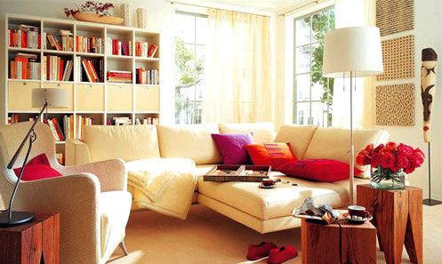 泛有綢緞光澤的枚紅色窗簾和米白色的壁紙,本身已構(gòu)成整個空間的背景色彩,再用適當(dāng)?shù)拿装咨鳛樯嘲l(fā)區(qū)的調(diào)節(jié)色,讓客廳更加溫暖、舒適。