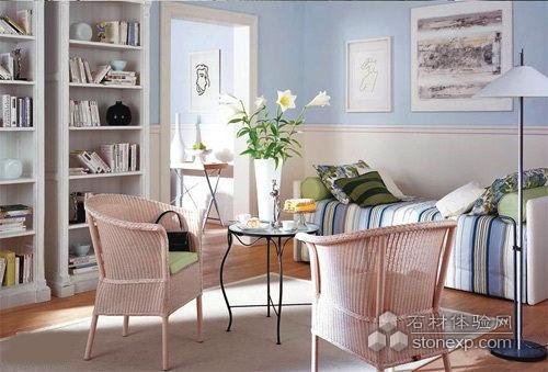 打造手段:天藍(lán)色墻漆+淺色藤椅+軟裝飾
