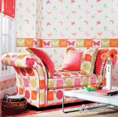 像糖果一樣色彩豐富的房間,最引人注目的無疑是沙發(fā)區(qū)后的蝴蝶背景墻,以漂亮的配色帶給家居甜美的氛圍。