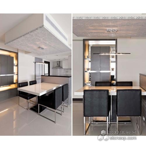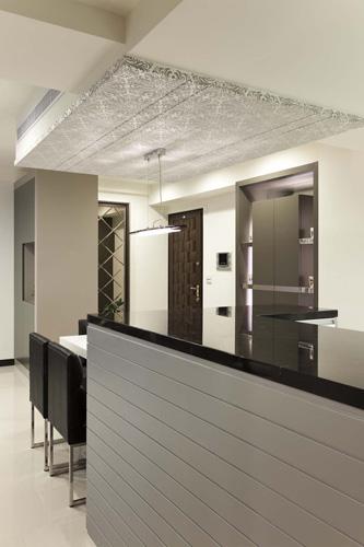 響應(yīng)屋主希望整體空間要有大器而通透的格局,客、餐廳以開(kāi)放式設(shè)計(jì),延展各區(qū)之間的互動(dòng)與流暢感,客廳電視墻則特別采用大圖輸出作為主景,輔以冰柱玻璃的妝點(diǎn),使畫(huà)面看起來(lái)立體有層次,顏色也更加鮮艷。餐廳選擇銀色花紋壁紙修飾上方的空調(diào)設(shè)備,連貫的設(shè)計(jì)也銜接至廚房的空間,吧臺(tái)兼?zhèn)洳团_(tái)為滿(mǎn)足屋主想要的美式時(shí)尚感,所用的材質(zhì)色調(diào)便以黑、銀色為主,加上餐邊柜做搭配,豐富立面中的景致與層次變化,流露不凡的品味與氣韻。