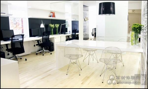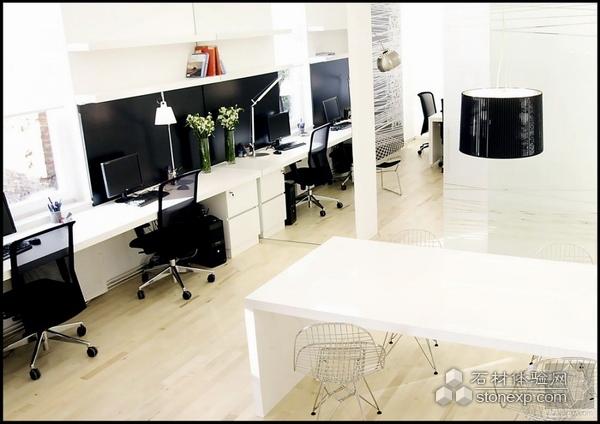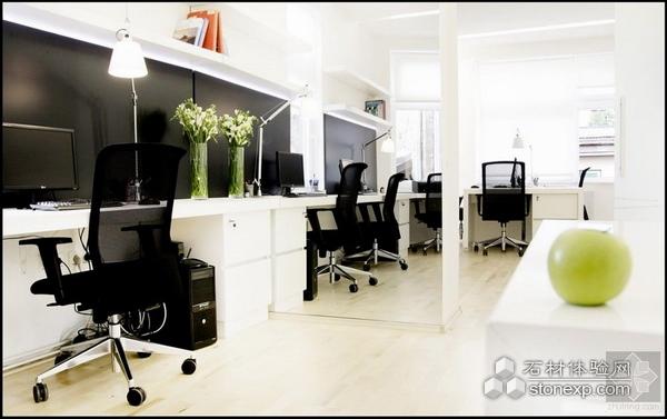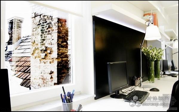 該建筑設(shè)計(jì)工作室位于薩拉熱窩一個早期的20世紀(jì)轉(zhuǎn)換公寓樓內(nèi)。工作室占地65平方米,包括兩個房間,一個小廚房和衛(wèi)生間。主要設(shè)計(jì)目標(biāo)是基于這樣一種想法:通過運(yùn)用白色、反射面和鏡子,放大自然采光,在視覺上擴(kuò)大相對較小的空間,創(chuàng)造一個充滿生機(jī)和“樂觀”的空間。設(shè)計(jì)中的單色配色方案(黑色和白色)提供工作場所諸如建筑辦公室的一個“中立背景”,但它也與一個窗口景觀- 屋頂?shù)氖搴痛u塊以及附近的建筑的煙囪形成了一個高度對比。