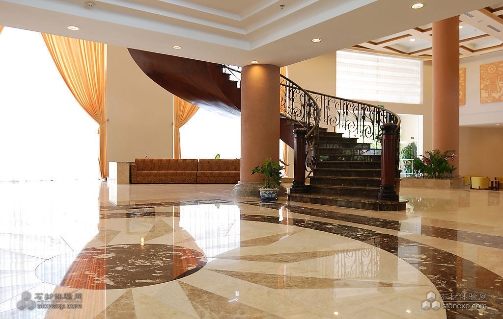 這是一個(gè)酒店大堂空間,大型的室內(nèi)地面拼花,極具古典風(fēng)格的旋梯。