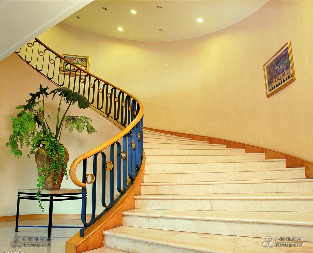 自下而上的旋梯,曲線自然。扶手采用實(shí)木和鐵藝的結(jié)合,營(yíng)造出古典的氛圍。