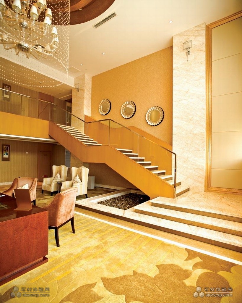 這是一家酒店的前臺設計,空間顏色過度自然。通往二樓的樓梯采用了金蜘蛛作為材料,和實木,玻璃相結合,非常具有現(xiàn)代感。