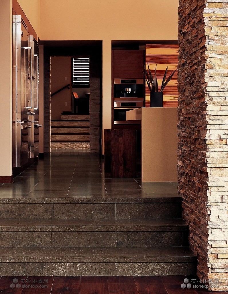 簡單描述:國外開放式廚房樓梯設(shè)計,整個廚房地面采用了咖啡色石材,高貴典雅。