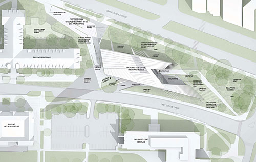 哈迪德的設(shè)計方案是一幢棱角分明的、低矮的、與地平線平行的建筑物和室外雕塑花園。這幢三層的博物館(包括地下室),將展出現(xiàn)代藝術(shù)品。這些陳列品一些將來自該?,F(xiàn)有收藏品,一些將來自這個博物館廣泛收藏的現(xiàn)代主義作品。這幢建筑將是密歇根州立大學(xué)的校園里的最“前衛(wèi)的”建筑。這個學(xué)校的歷史可以追溯到19世紀中葉,它的建筑風(fēng)格多樣——從“維多利亞風(fēng)格”到“國際風(fēng)格”。